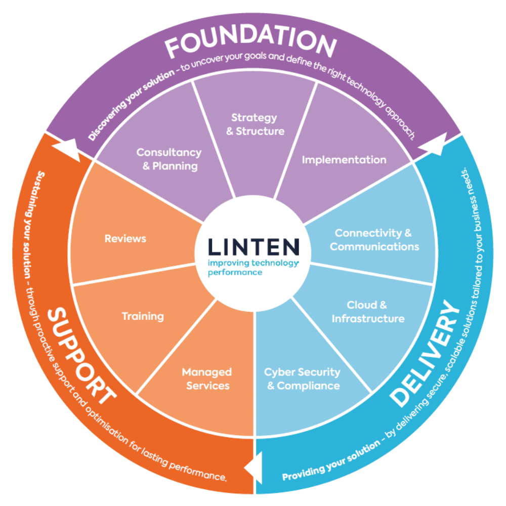 Our Service Wheel is built for that exact moment when you’re ready to move from firefighting to forward planning. It’s more than a diagram – it’s how we stay accountable, measure what works, fix what doesn’t, and keep your technology aligned with your business goals.